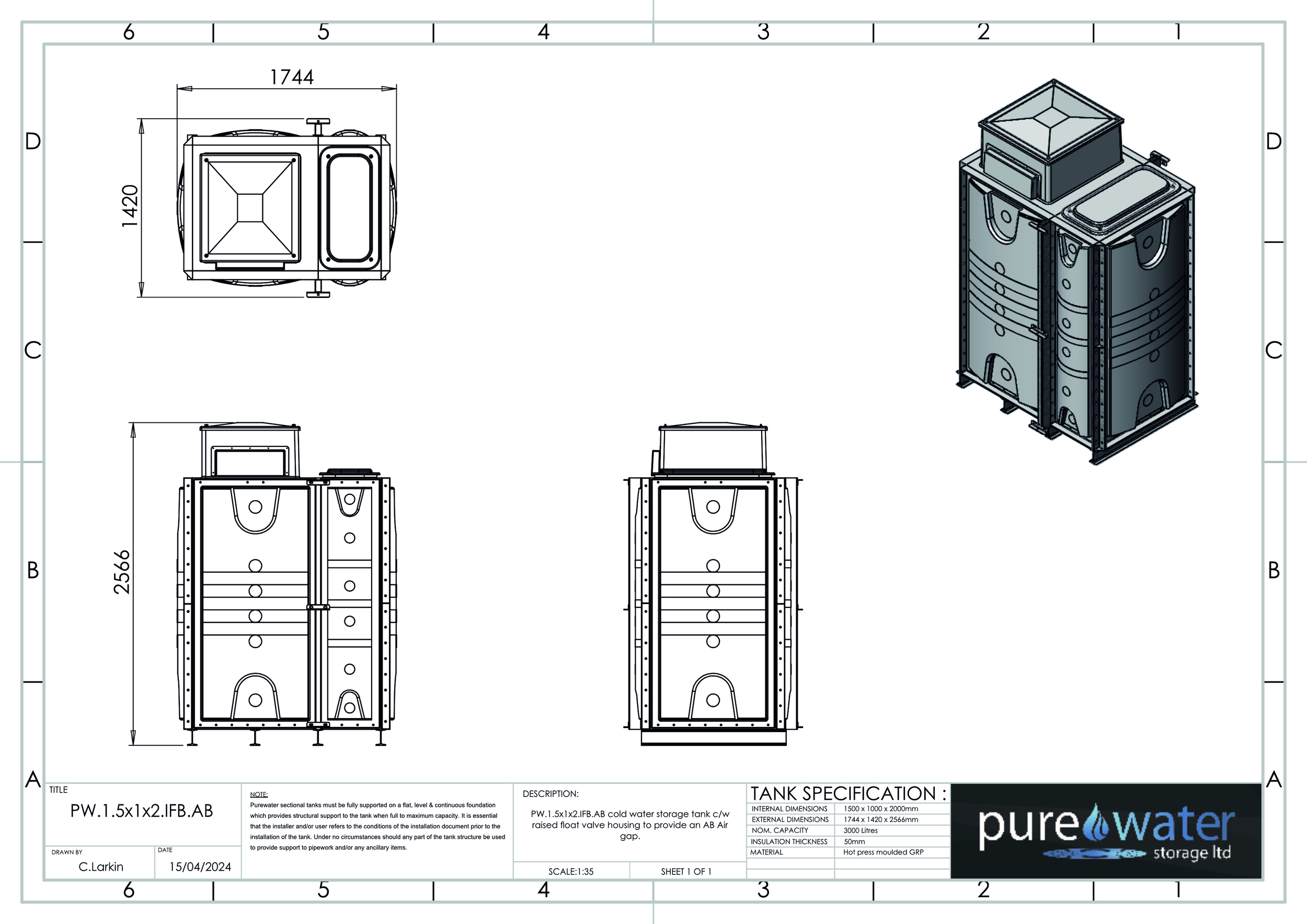 3000 LITRE SECTIONAL WATER TANK, INTERNALLY FLANGED BASE (IFB)