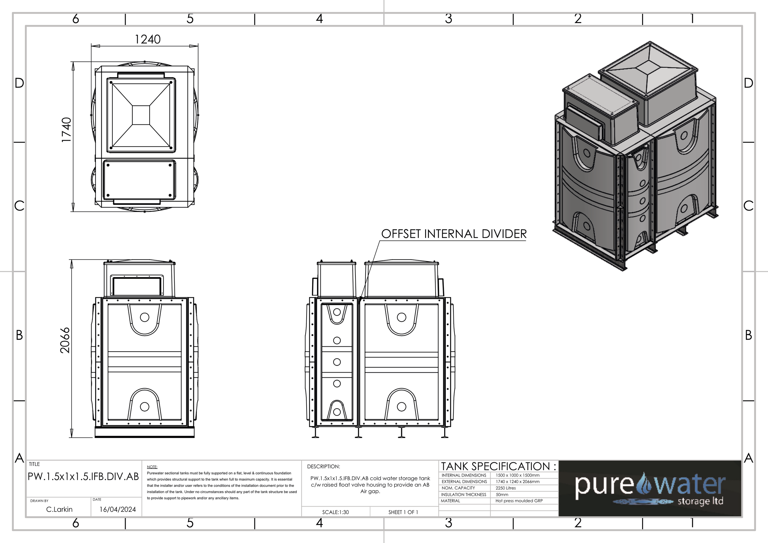2250 LITRE DIVIDED SECTIONAL WATER TANK, INTERNALLY FLANGED BASE (IFB)