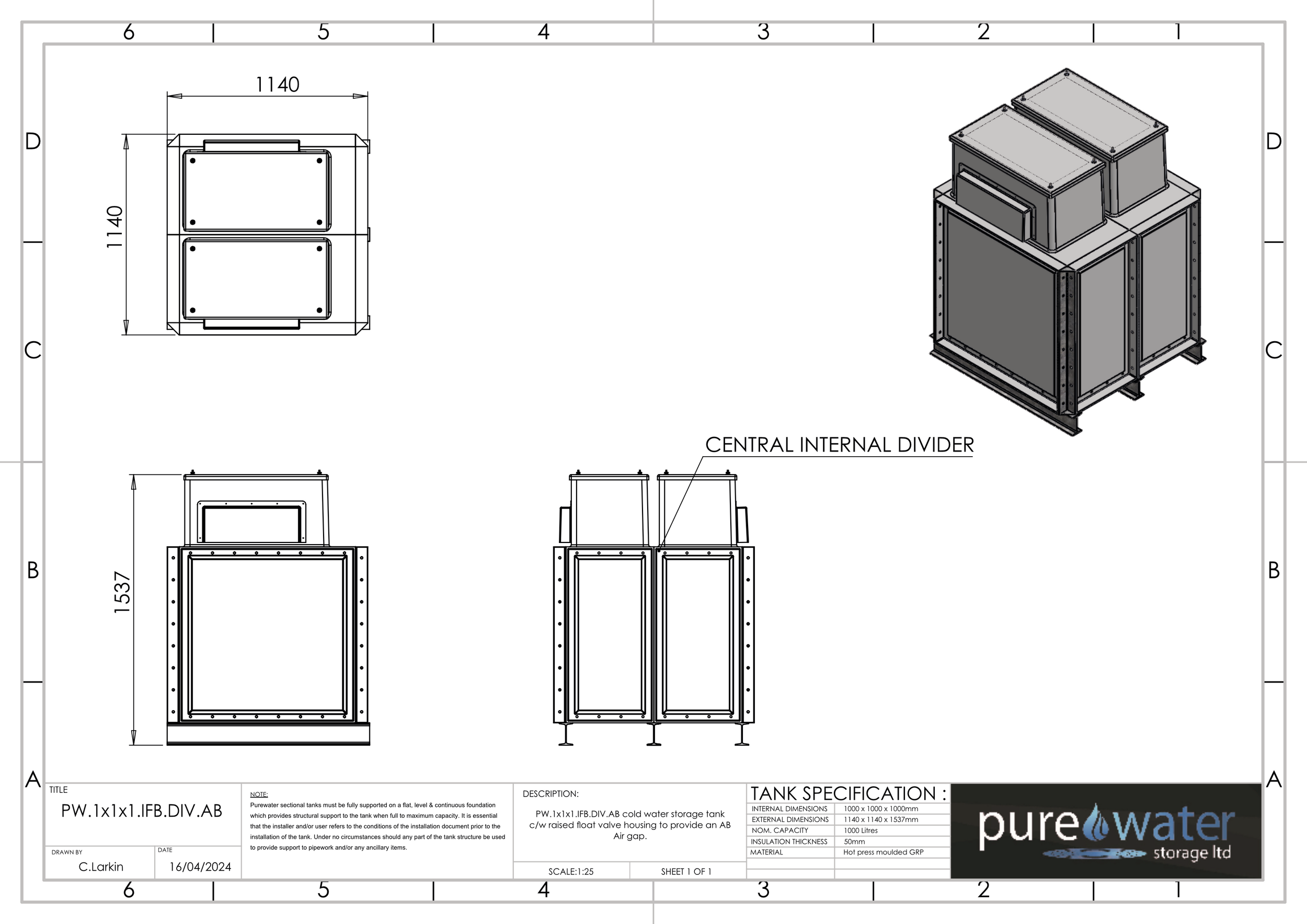 1000 LITRE DIVIDED SECTIONAL WATER TANK, INTERNALLY FLANGED BASE (IFB)