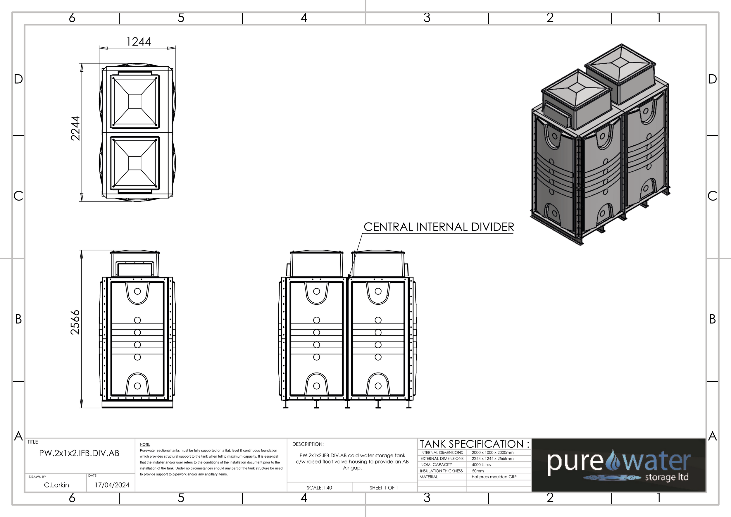 4000 LITRE SECTIONAL WATER TANK, INTERNALLY FLANGED BASE (IFB)