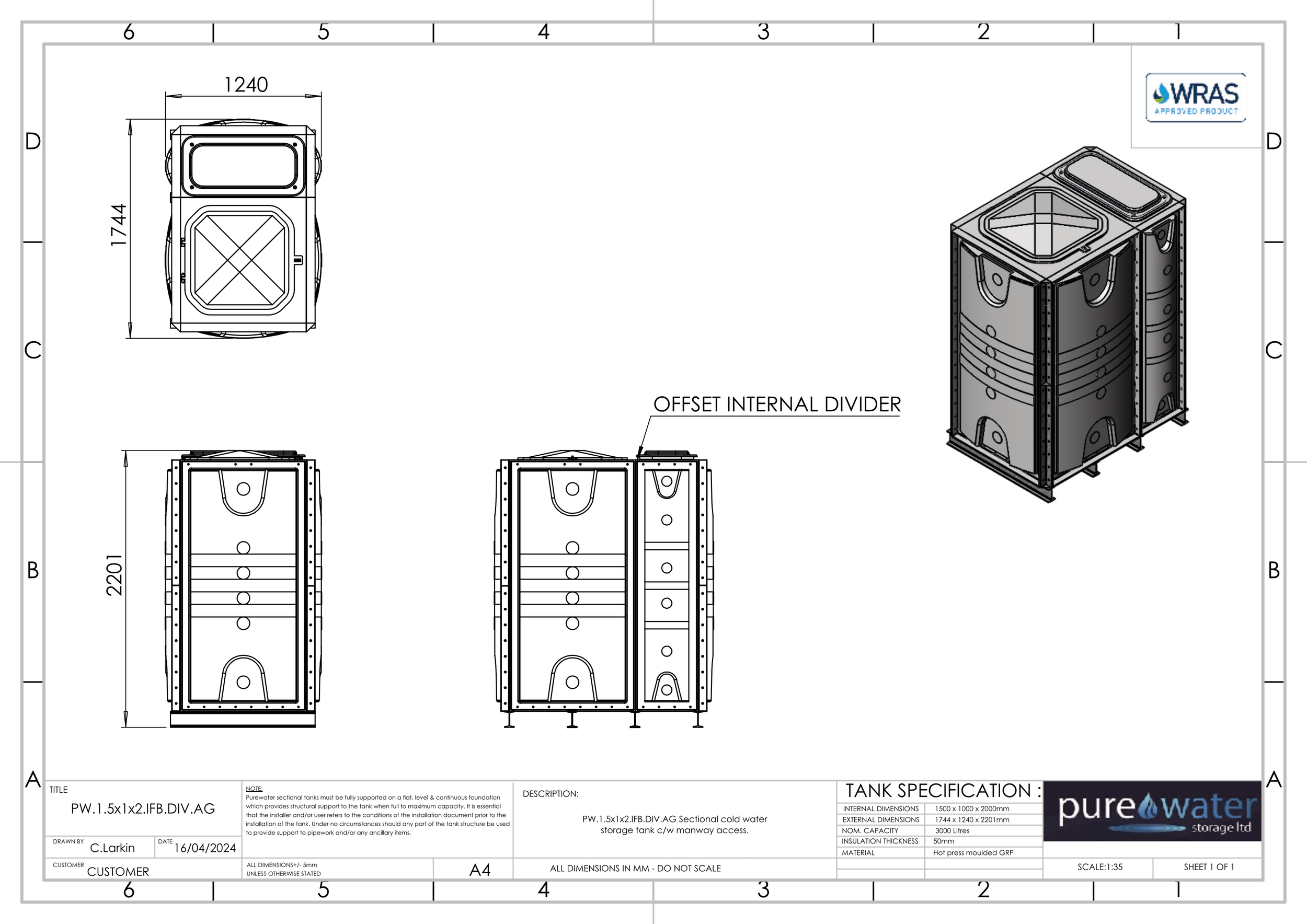 3000 LITRE SECTIONAL WATER TANK, INTERNALLY FLANGED BASE (IFB)