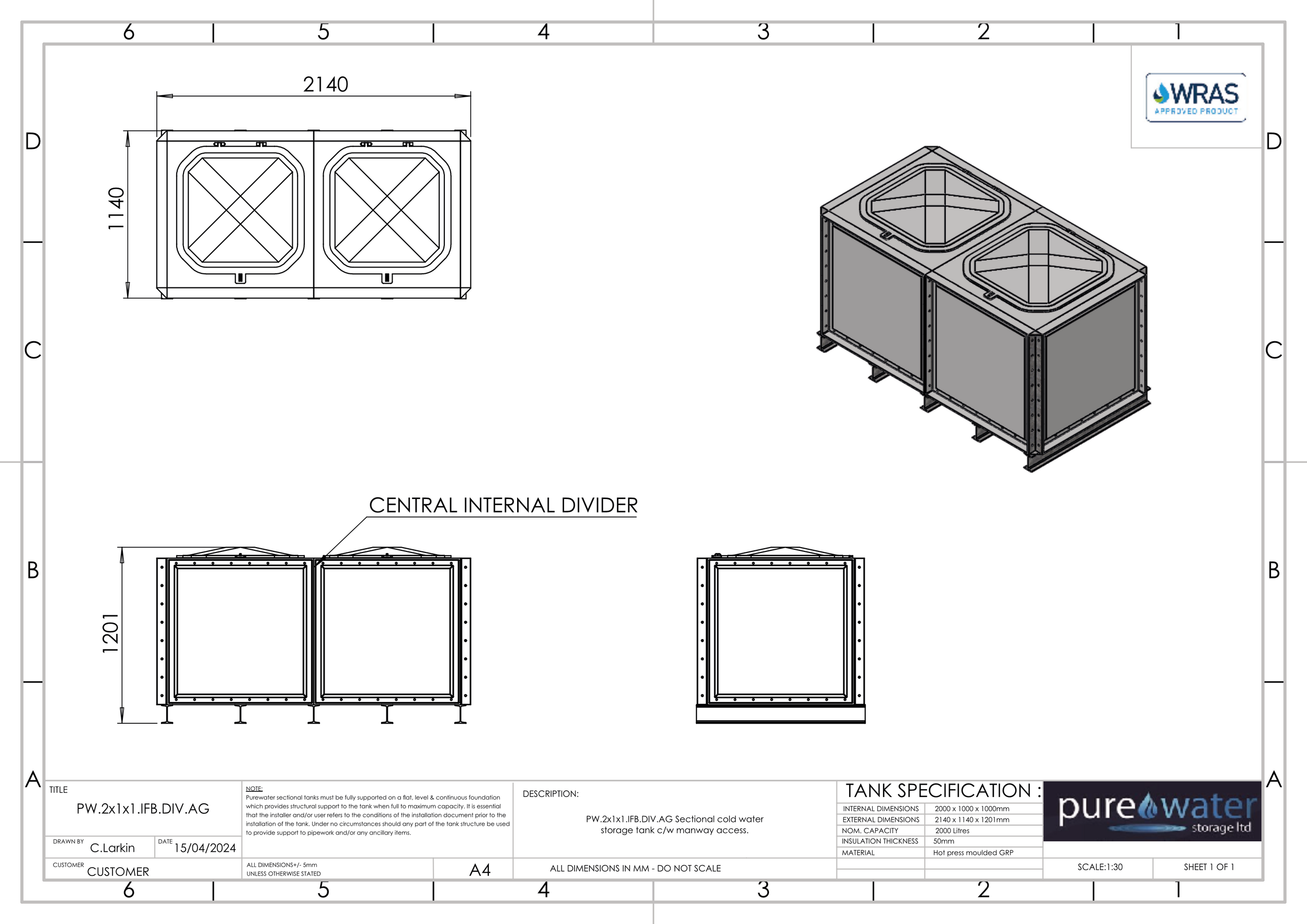 2000 LITRE DIVIDED SECTIONAL WATER TANK, INTERNALLY FLANGED BASE (IFB)