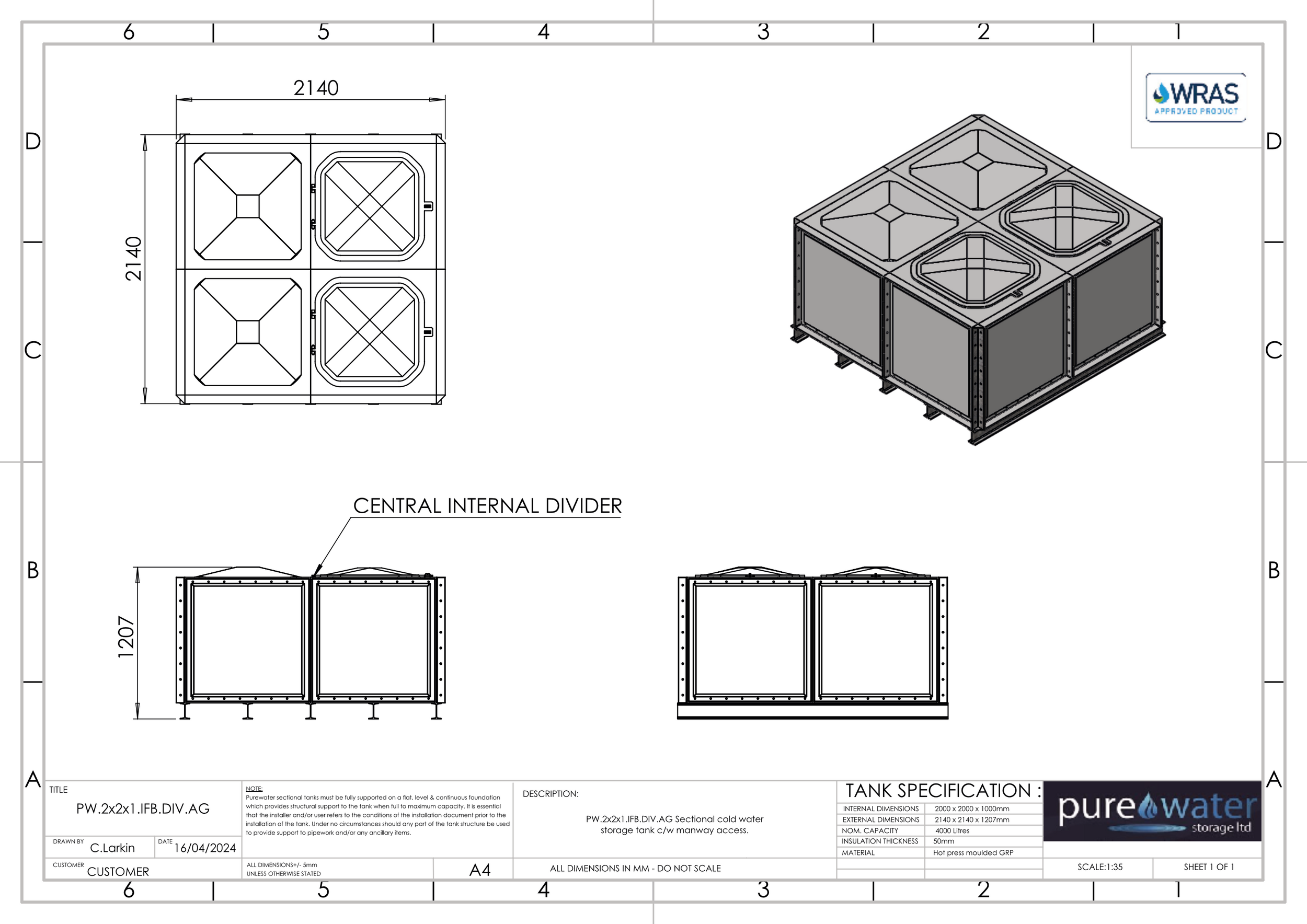 4000 LITRE DIVIDED SECTIONAL WATER TANK, INTERNALLY FLANGED BASE (IFB)