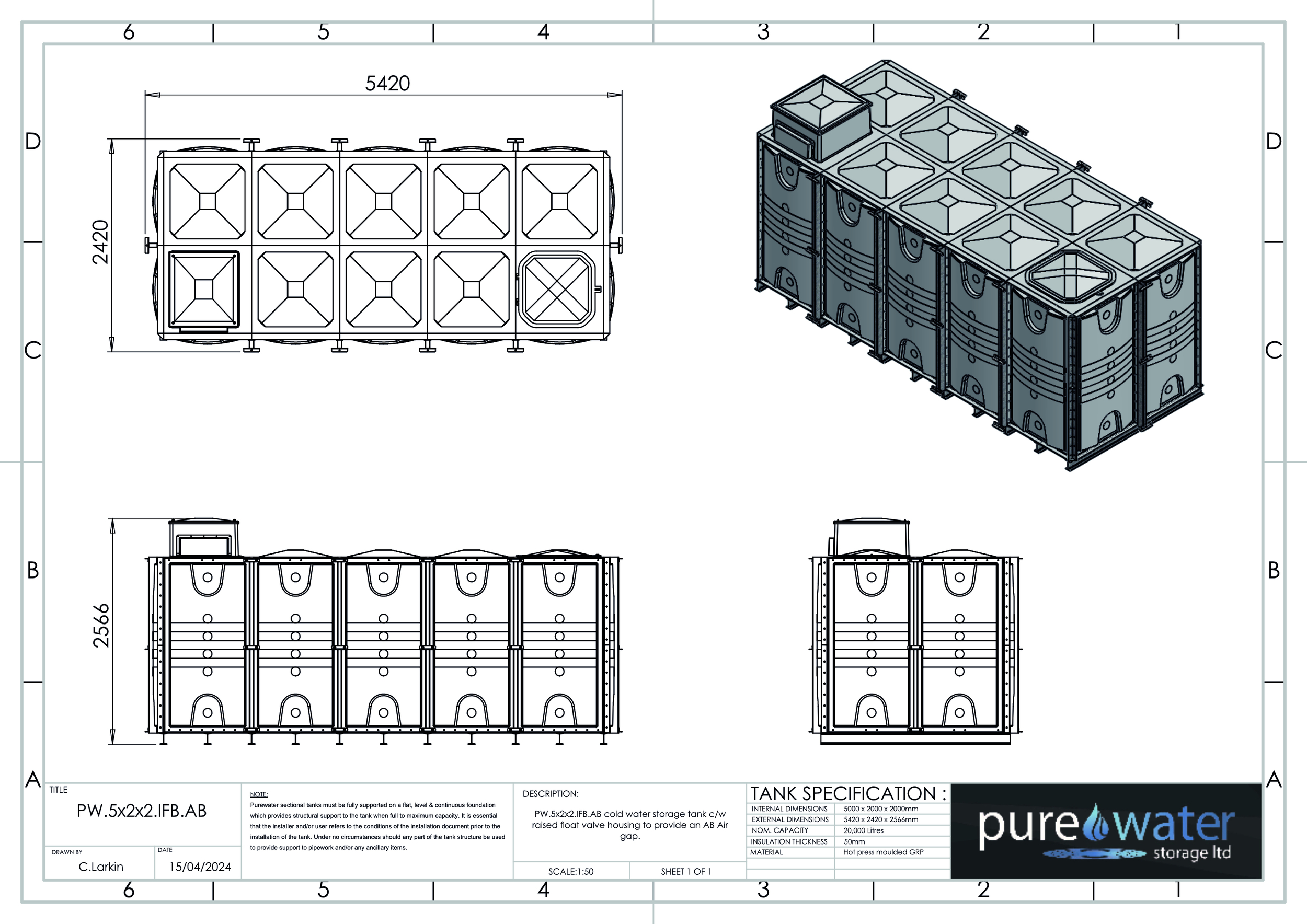 20000 LITRE SECTIONAL WATER TANK, INTERNALLY FLANGED BASE (IFB)