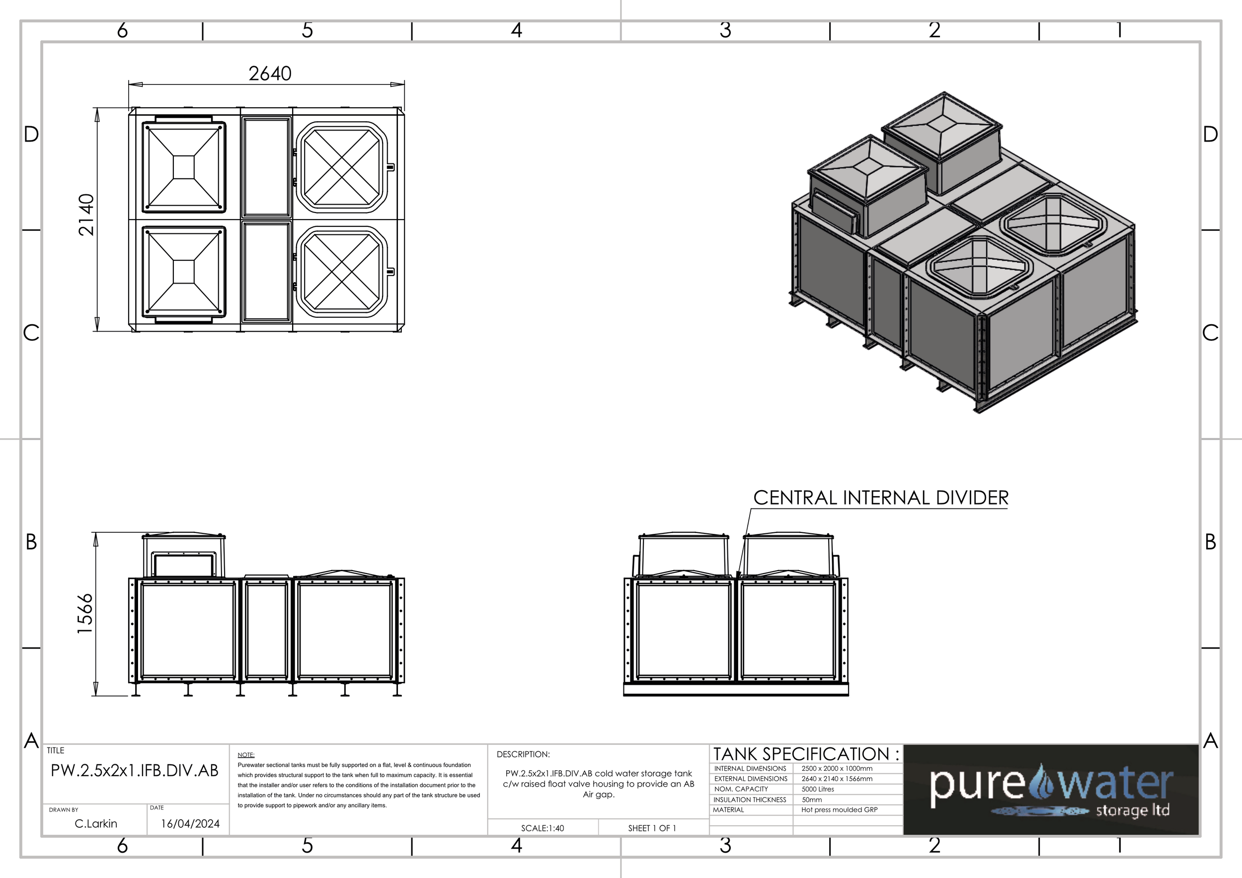 5000 LITRE DIVIDED SECTIONAL WATER TANK, INTERNALLY FLANGED BASE (IFB)