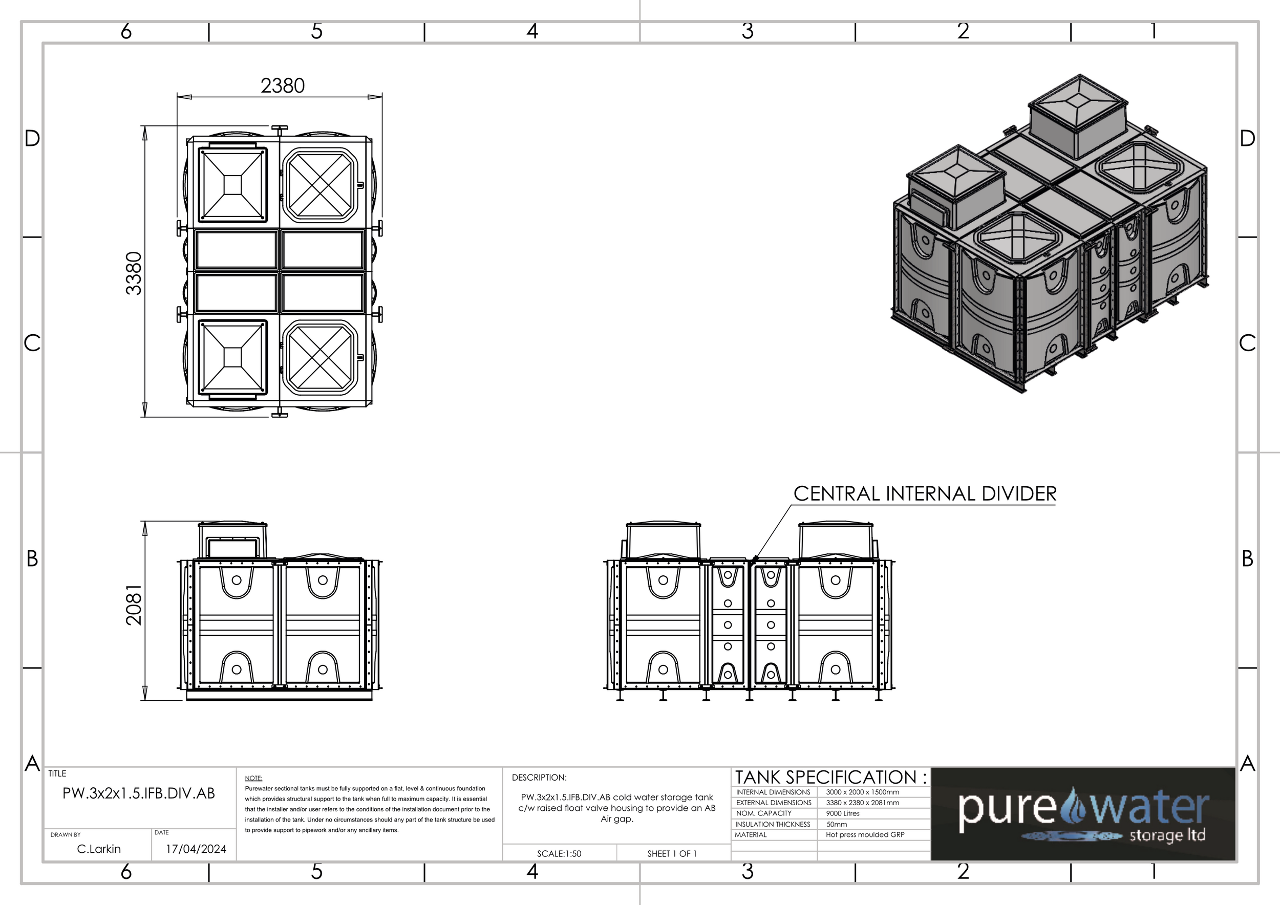 9000 LITRE DIVIDED SECTIONAL WATER TANK, INTERNALLY FLANGED BASE (IFB)
