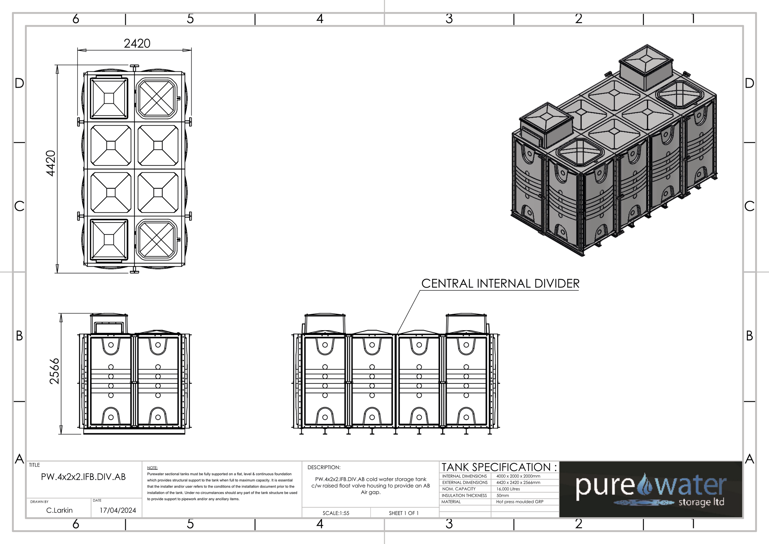 16000 LITRE DIVIDED SECTIONAL WATER TANK, INTERNALLY FLANGED BASE (IFB)
