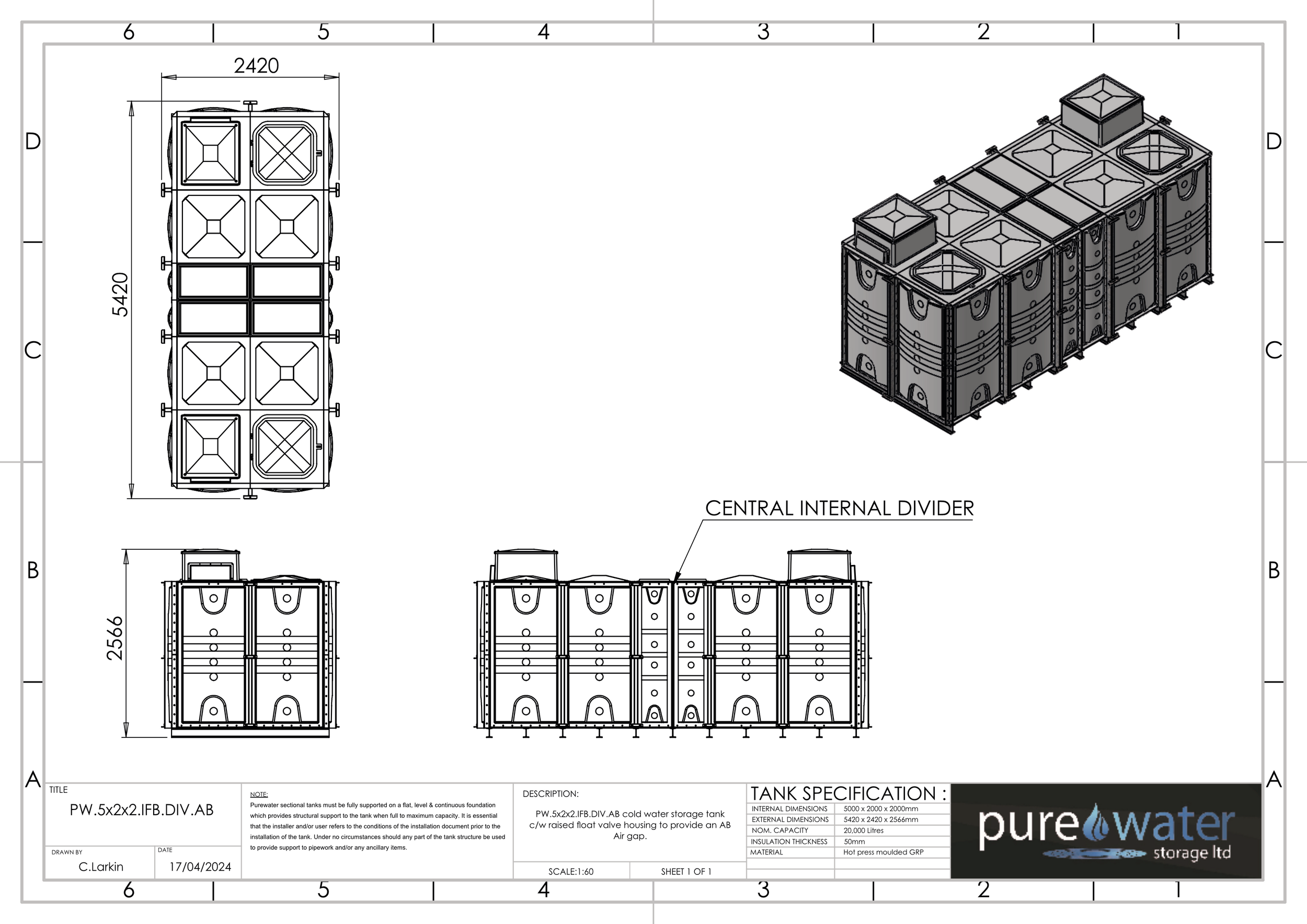 20000 LITRE DIVIDED SECTIONAL WATER TANK, INTERNALLY FLANGED BASE (IFB)
