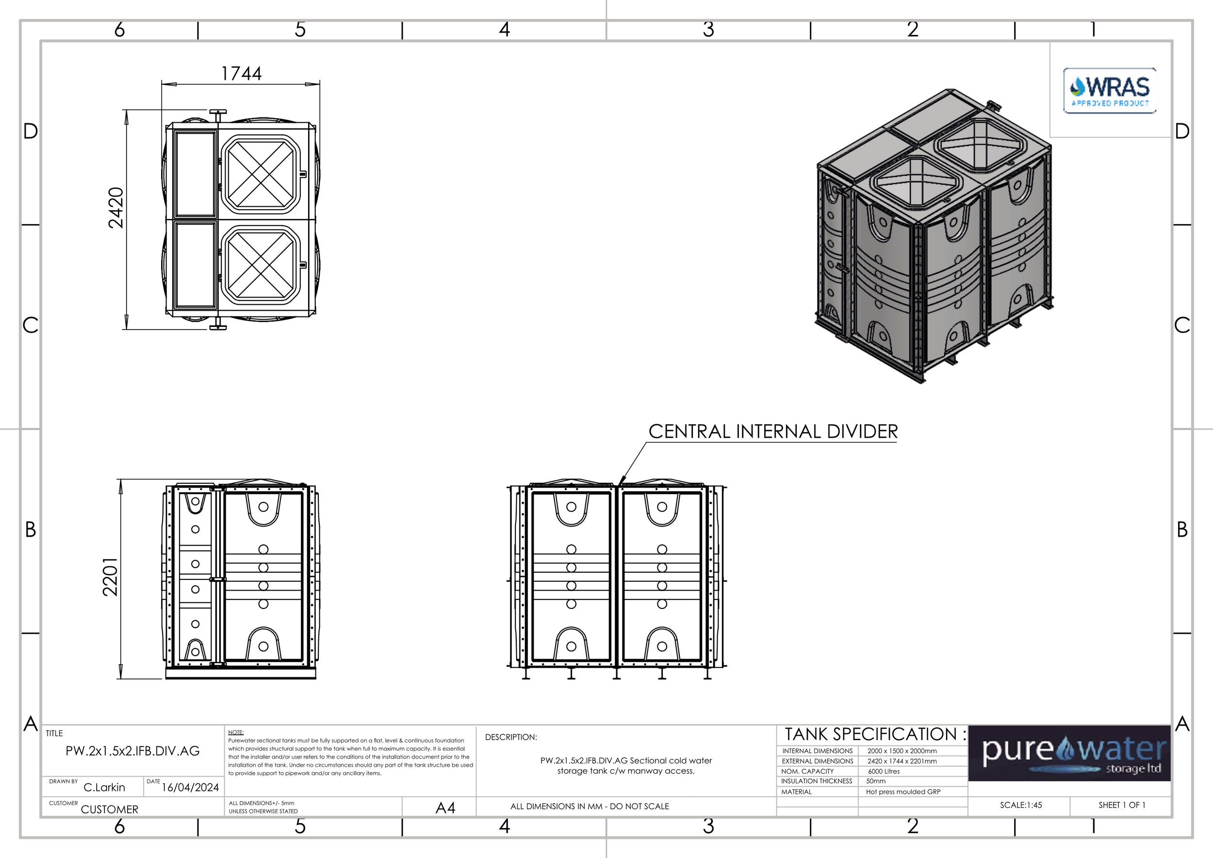 6000 LITRE SECTIONAL WATER TANK, INTERNALLY FLANGED BASE (IFB)