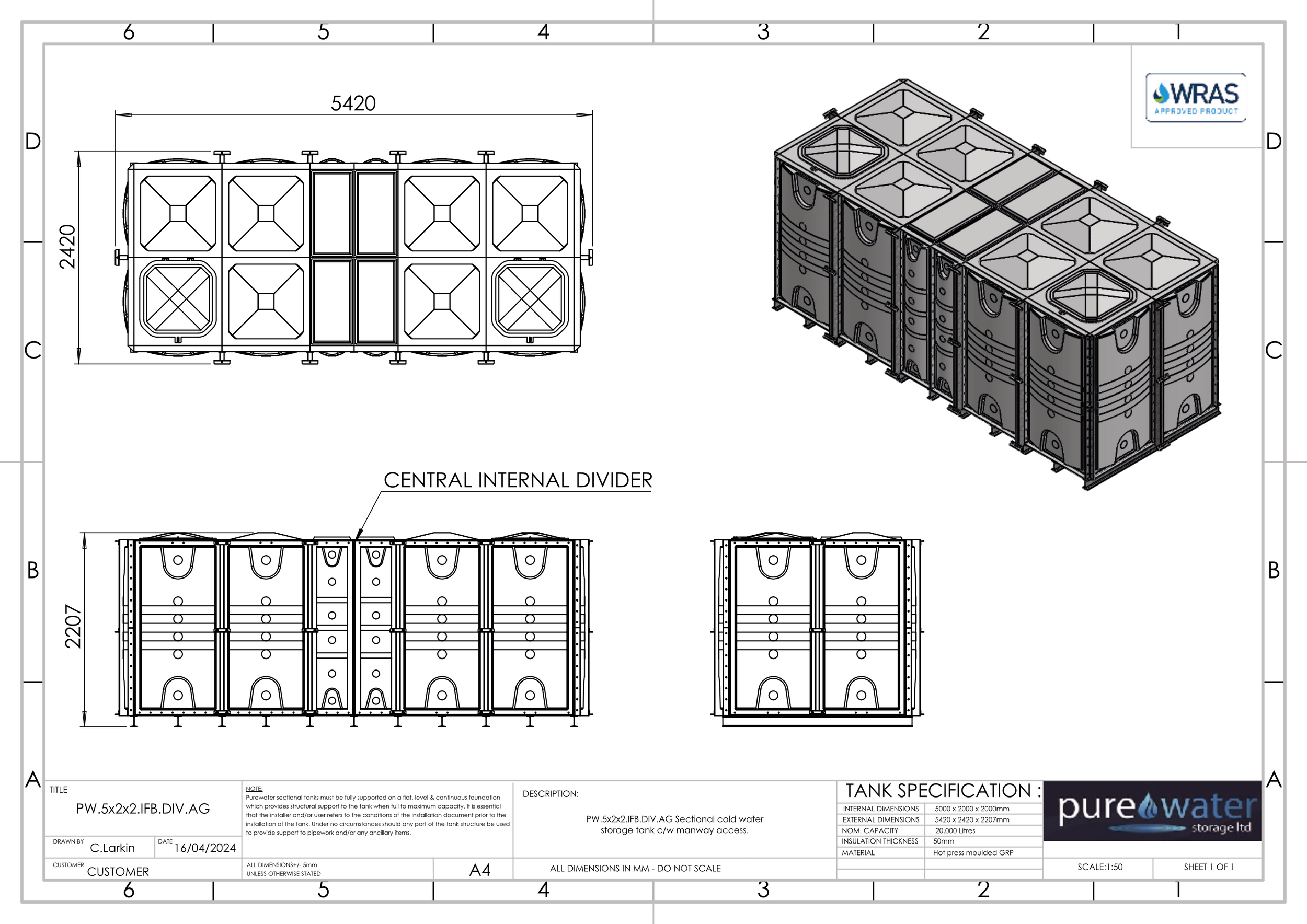 20000 LITRE DIVIDED SECTIONAL WATER TANK, INTERNALLY FLANGED BASE (IFB)